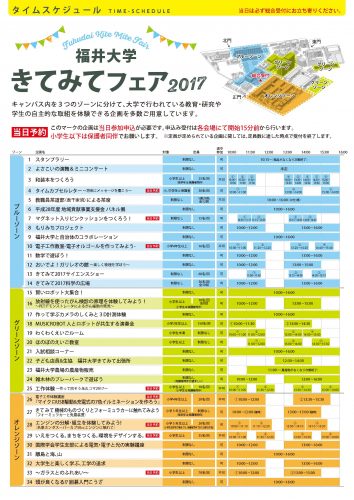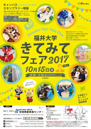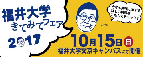福井大学では、大学の教育や研究、学生の活動や取組を、地域の皆様に広く知ってもらうことを目的に、毎年「福井大学きてみてフェア」を開催しています。工作などの体験のほか、英語に親しむ企画、大学農場採れたての農産物販売コーナー、本学が協定を結んでいる自治体が各取組を紹介するブースなどがあり、大学の研究や活動を見て聞いて学べる1日となっています。