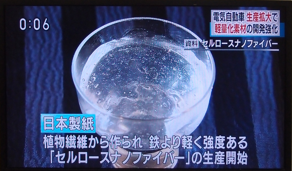 お昼のNHKニュース(2017.9.30)でセルロースナノファイバーが何気に紹介されていましたのでご紹介いたします。なぜこのタイミングかと思いましたが。