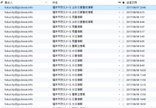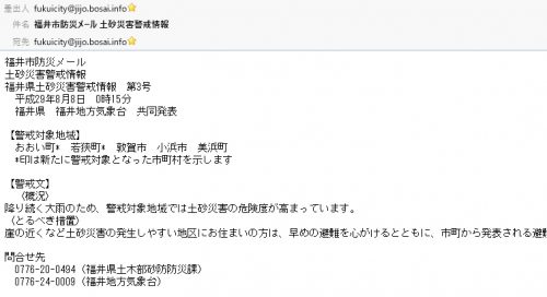福井県の各市では、こうした防災情報をメールで通知するサービスを提供しているようです。また、新聞社などでもそうしたサービスがあります。こうしたサービスは全国の各都市でも利用出来るのかと思います。
