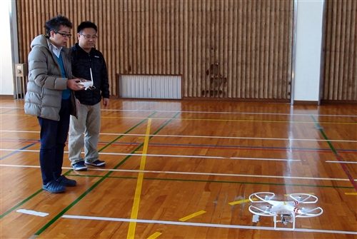 開発したシステムを活用するためにも、研究上、飛行技術の向上がとても重要です。ドローンの操縦ワザについて、福井高専の高久先生にアドバイスをいただいている光景です。高久先生はラジコン飛行機を独自に設計され、それを自在に飛ばせる、また、福井県内でも先生しか出来ない飛行技術があったりと、ものすごいラジコン操縦技術を有している先生なんです。