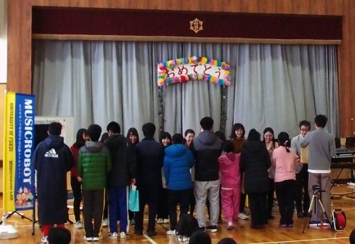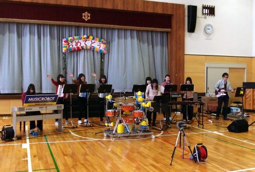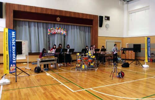 当研究室で開発した打楽器演奏ロボットIROPS-3号機を使ったミニライブで、教育学部音楽科の在学生とのコラボユニットにより行いました。アドバイザーとして福井大学教育学部の声楽家 梅村憲子先生に歌唱や全体のバランス調整などをご指導いただきました。また、天方教頭先生には音響ミキサーのコントロールをしていただきました。