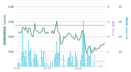 福井市内の研究室内でのモニタリング値ですが、コンクリートなどの建材、場所などで屋外よりも高い値になっています。以下は、福井県原子力環境監視センターによるモニタリングの様子です。これは福井市の屋外での空間放射線線量ですが、風向きや風速、降水量によっても変動します。