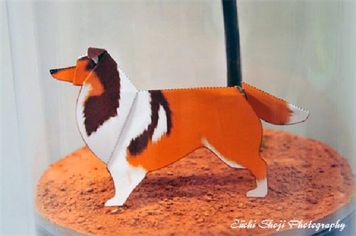 研究室で開発している高分子アクチュエータ(人工筋肉)を使うと、切り紙、ペーパクラフトなどで制作したものの部位の一部を乾電池1~2本の電圧で可動させることが出来ます。モータでは音がするし、大きいし、重たいし、無理と非現実的な状況でも、高分子アクチュエータは厚さが0.2~1mm程度と薄く、必要な大きさに切って使うので、小さい可動部分に取り付けられます。この高分子アクチュエータの素子自体は1V程度から動くので安全です。