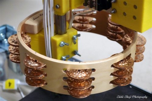 また、本システムの最大の特徴は、打楽器制御ユニットに接続して、本物の打楽器のタンバリン、クラベス、ウッドブロック、スレイベル、スネアドラム、バスドラムなどを演奏できることです。すなわち、車椅子やベッドの上から、意思伝達装置、スイッチを介して、本物の打楽器を”自分の意思”で演奏できます。バリアフリーMUSICROBOTとして人とロボットが共生する技術で合奏を実現します。