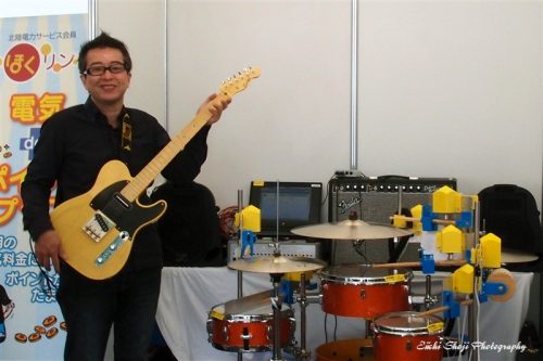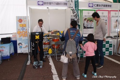 ご来場のみなさんに、大きなたいこ、ド~ン ド~ン、小さなたいこ、トントントンを、本物の打楽器で遠隔演奏して頂きました。操作は単純ですが、これがとても楽しいのです。まだまだ改良の余地はありますが、とても楽しめるものとなりました。車椅子のおばあさんがブースに来られたので、演奏して頂きました!なんと90歳といいます、ご一緒の家族とともにみなさんがとても笑顔になりました。本物の打楽器の迫力だからとても楽しいのですね。