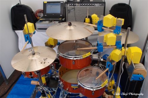 現在、MUSICROBOTは人とロボットの本格的な共生を実現するために、機械学習、強化学習、深層学習などによる人工知能の実装を進めています。今回の展示ではその紹介のために、打楽器演奏ロボットはIROPS-3号機を搬入しました。この3号機は高品質な11種の打楽器を選んで小型化したロボットとなっています(基本ドラムセット、ウッドブロック、カウベル、タンバリン、カバサ)。