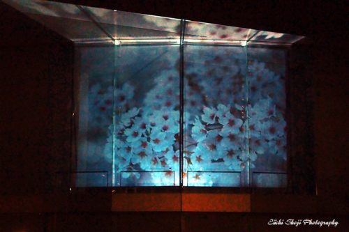 上映時間は、約5分です。映像は音楽にシンクロしています。本システムはライブ演奏でプロジェクションマッピングが出来る独自の技術となっておりますが、今回はライブ演奏は行いません。電子音源により屋外での音量は下げて上映いたします。