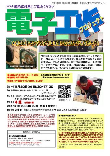 いつもブログをご覧いただきありがとうございます。電子工作ファン、ラジオ工作ファンのみなさま、お待たせしました。コロナ感染症対策により、3密を防ぐ観点から規模を縮小して、「夢を拓く電子工作プロジェクト 2021」の3回目を11月20日(土)に開催します。ラジオ工作は世代を越えて楽しめる電子工作の原点です。みなさまとラジオの話題で花が咲きますこと、楽しみにしております。ご関心、お時間ございましたら、よろしくお願いいたします。