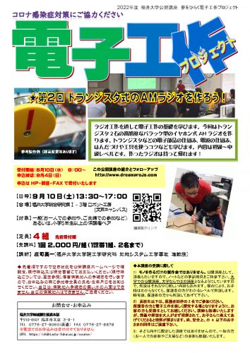 いつもブログをご覧いただきありがとうございます。電子工作ファン、ラジオ工作ファンのみなさま、お待たせしました。コロナ感染症対策により、3密を防ぐ観点から規模を縮小して、「夢を拓く電子工作プロジェクト 2022」の2回目を9月10日(土)に開催します。ラジオ工作は世代を越えて楽しめる電子工作の原点です。「夢をひらく電子工作プロジェクト」は本年度で15周年を迎えます。本年度もみなさまとラジオの話題で花が咲きますこと、楽しみにしております。ご関心、お時間ございましたら、よろしくお願いいたします。