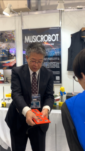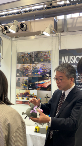 また、ぬいぐるみを使って手軽に音楽体験に参加できる仕組みも紹介しました。柔らかい素材を手に持って振ったり叩いたりするだけで演奏に加われるこのスタイルは理屈不要で、子どもから大人まで直感的に楽しめる新しい音楽参加の形です。今回のテクノフェアでは「もちもちころころ合奏隊」として紹介し、サンリオ様の商品を許諾を得て活用させていただきました。