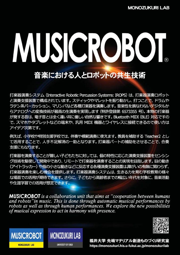 本技術は特許技術になっています。演奏支援機器と組み合わせることでインクルーシブに様々な場面で活用できます。 打楽器パートの補助役として演奏に参加させることで、演奏会や発表会はよりドラマチックに、個人やグループの楽器練習、学校での音楽の授業、生涯教育などがより楽しくなります。本物の打楽器の響きで楽しめます。