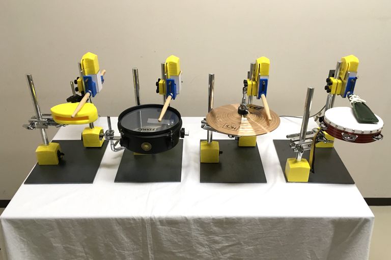 学校の音楽室にある打楽器をクランプで固定し、自動演奏化が可能です。