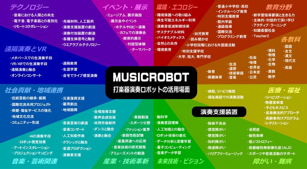 打楽器演奏ロボットと演奏支援装置や演奏支援アプリによる打楽器演奏システムDXは、幼児教育、学校教育、福祉、生涯学習、または演奏家の相棒としてなど、障がいや世代を越えた音楽文化を様々な視点から革新します。各種の演奏支援手段の開発戦略は、音楽の力で、音楽的コミュニケーション能力を育むことを目指しています。一人一人が快適で活躍できる超スマート社会の多様性と包摂性に対応できるので、このプラットフォームが障がいの有無に関わらず楽しめる音楽活動の新たな扉を開きます。
