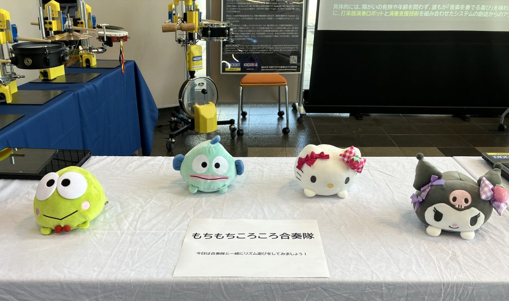 株式会社サンリオ様の正式なご快諾をいただき、PPIH販路限定商品「もちもちころころ」に演奏支援システムを組み込み、ぬいぐるみを使った「もちもちころころ合奏隊」です。別の展示会で、もちもちころころ合奏隊は大人気!