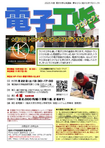 「夢をひらく電子工作プロジェクト 2025」の2回目を11月22日(土)に開催します。ラジオ工作は世代を越えて楽しめる電子工作の原点です。みなさまとラジオの話題で花が咲きますこと、楽しみにしております。